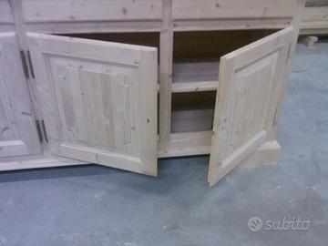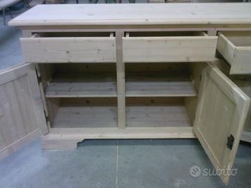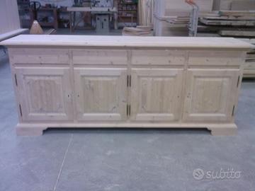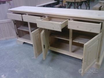 Credenza su misura e specifica del cliente in abete massello evaporato al forno assieme alla noce (giallino) con 4 cassetti di cui anche l'interno è di abete su cui scorrerà su guide in ferro normale. (possibilità di avere guide ammortizzate moderne con differenza) e 4 porte battenti che si apriranno su cerniere in stile e pannello applicato da dietro in modo che si possa togliere per lucidarlo o laccarlo. interno con ripiano aggiustabile in altezza completa di pomelli e chiavi. fianchi sempre in massello. le misure sono lunghezza 230 profondità 50 altezza 93. L'articolo è già stato prodotto e venduto su commissione non teniamo magazzino ma lo si può riprodurre uguale o in base alle proprie esigenze lo si costruisce dato che siamo i diretti produttori falegnami, lo vendiamo allo stato grezzo con possibilità a parte di lucidarlo o laccarlo a parte, nel prezzo è compreso imballo franco fabbrica iva non compresa. la si può fare di qualsiasi essenza e fattezza a misura del cliente. Per qualsiasi altra informazione non esitate a contattarci grazie. ASTENERSI RIVENDITORI E COMMERCIANTI