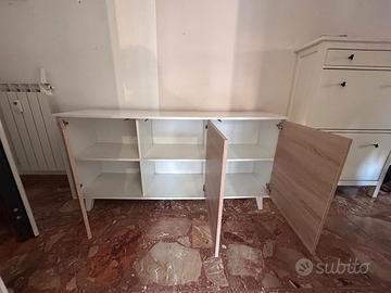 Misure: 154x40x75. Struttura bianca e ante con finitura in legno, sistema di apertura a pressione, 6 vani interni. Manca il piedino centrale.