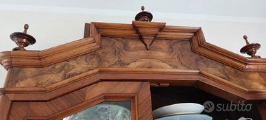 Credenza a due corpi divisibili, stile umbertino, epoca 1890/1900, tipica costruzione dell'epoca. Struttura in pioppo e noce, rivestita in noce. La parte superiore si stacca completamente dalla parte inferiore essendo 2 pezzi.