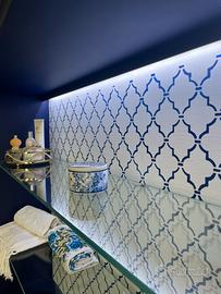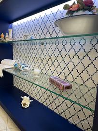 Credenza a giorno blu con sfondo bianco e decori blu.Due mensole di vetro,led regolabili.Multifunzionale, bellissima da inserire in un bagno ,libreria per un soggiorno ma anche elegante espositore per negozi ecc..