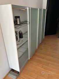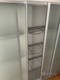 Credenza a muro con ante scorrevoli, progettata per ottimizzare lo spazio senza l'ingombro delle aperture a battente. * Ante: Il mobile monta quattro grandi ante scorrevoli in vetro satinato (acido) incorniciate da sottili profili in alluminio. Il vetro opaco permette di intravedere il contenuto senza esporlo completamente, mantenendo un aspetto ordinato. * Struttura: La scocca esterna è di colore bianco opaco, creando un contrasto pulito e luminoso con il metallo e il vetro. * Sistema di scorrimento: Le ante corrono su un binario metallico a vista alla base. L'interno è suddiviso in moduli verticali attrezzati con un sistema di scaffalatura molto specifico: * Ripiani a griglia: Invece dei classici ripiani in legno, il mobile utilizza griglie in acciaio inox. Questa scelta è tipica delle cucine professionali o di alta gamma perché: * Favorisce l'aerazione (ottimo per stoviglie o piccoli elettrodomestici). * È estremamente igienica e facile da pulire. * Ha un'alta capacità di carico. * Modularità: I fianchi interni presentano la classica foratura a passo costante, permettendo di regolare l'altezza delle griglie in base alle proprie esigenze. Con una misura di 160 cm di altezza e 320 cm di larghezza, il mobile ha uno sviluppo orizzontale imponente. * L'altezza di 160 cm lo rende una "madia alta": non arriva al soffitto, lasciando spazio sulla parte superiore per eventuali oggetti decorativi o per mantenere una sensazione di respiro nella stanza. * La profondità contenuta (visibile dal profilo laterale) lo rende ideale per corridoi larghi o zone dining, fungendo da dispensa capiente ma non invasiva.