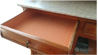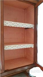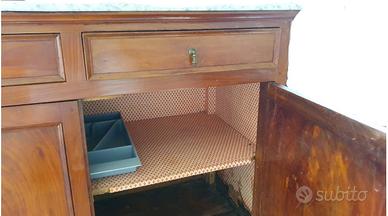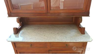 Credenza antica, probabilmente risalente alla fine del XIX o all'inizio del XX secolo, stile classico con materiali pregiati come il legno massello e il marmo (piana). La struttura è composta da una parte superiore con due ante in vetro, decorate con motivi intagliati, e da una parte inferiore con due ante e due cassetti in legno. Restaurata da circa una ventina d’anni. h = 264 cm l = 122 cm p = 57 cm la parte centrale è alta 30 cm e si può togliere in modo che l'altezza totale rimare 234 cm