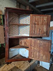 Credenza Romagnola in legno Mobile angolare con 2 ante. Originale romagnola sempre tenuta in casa in cantina, risale sicuramente a prima degli anni '40 In buone condizioni, anche utilizzabile ma eventualmente da restaurare Legno integro non sembra ci siano termiti. Eventualmente visibile senza impegno Misure Altezza 203 cm Larghezza davanti 100 cm Lati dietro 71 x 71