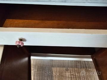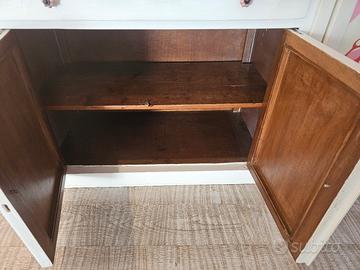 presenta due colonne con all'interno tre ripiani un vano con un ripiano adibito a vetrina, cinque cassettini un cassetto grande e due ante. Il ripiano è in marmo. presenta logicamente segni di usura.