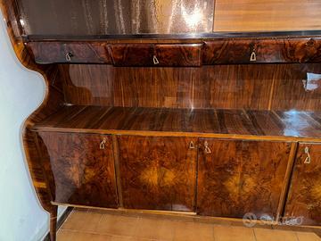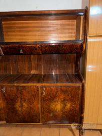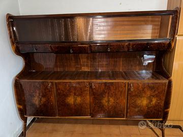 Credenza vintage risalente agli anni '60. La struttura é composta da: 2 ante scorrevoli in vetro nella parte superiore, 4 ante con sportellino nella parte inferiore e 4 cassetti al di sotto nelle ante scorrevoli. Misure 203x34xh175 Da smontare - Ritiro a mano Pagamento in contanti - Prezzo trattabile