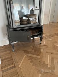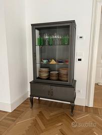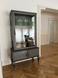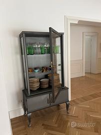 Credenza antica Art Déco/anni '50 vintage con 2 ante sotto e unica anta a vetro sopra con due ripiani in vetro. Struttura grigio antracite, maniglie/chiavi d’orate Misure: 92x44. Altezza 175