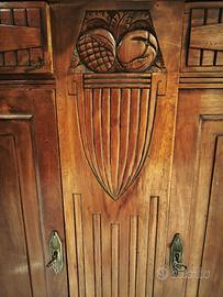 Credenza antica in legno massello con vetrina cristalliera, dotata nella parte inferiore, di due ante in legno e due cassetti con decori che risaltano l'eleganza del legno, sul piano della base di appoggio, c'è un marmo antico originale avorio con venature rosse di lusso. La parte superiore è suddivisa in tre parti: due ante in legno con lo stesso decoro della parte inferiore, e un'anta centrale con vetro trasparente e liscio, con la cornice decorata nella parte alta. Gambette tornite con spalle smussate. Maniglie, chiavi e serrature originali. Misure: Altezza 200cm, Profondità 52cm, Larghezza 150cm. Non sono previsti spedizioni e trasporto. Solo ritiro in zona Caserta. Per ulteriori informazioni contattatemi su Subito.