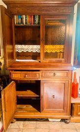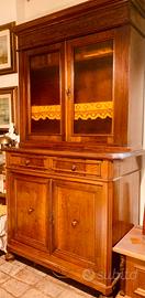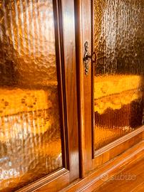 La parte superiore presenta due ante con vetri originali ideali per esporre servizi di piatti, libri o oggetti decorativi. La parte inferiore è composta da due cassetti e un ampio vano con ante, molto capiente e pratico per stoviglie, biancheria o altri oggetti.