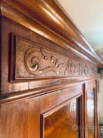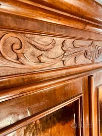 Elegante credenza italiana con alzata a vetrina, realizzata in noce massello e risalente ai primi decenni del ‘900 (circa 1900–1920). Mobile di gusto tradizionale italiano / provinciale, con bella cornice superiore e fregio centrale finemente intagliato a mano, tipico della lavorazione artigianale dell’epoca.