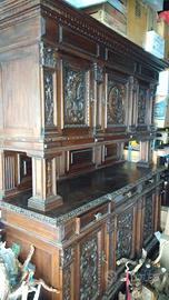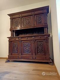 Credenza antica, circa fine 1800, in noce intagliato, molto bella e ancora in ottime condizioni. Composta da due sezioni staccabili. Alta 216 cm, larga 55 cm e lunga 183 cm. Con 3 cassetti nella metà inferiore e 3 porte su ciascuna metà munite di chiavi, di cui 3 hanno la serratura danneggiata.