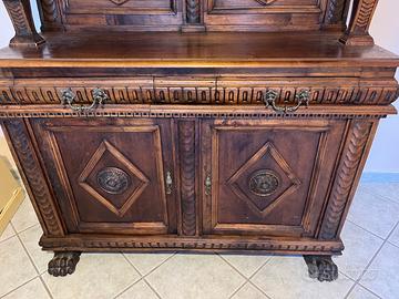 Grandi cariatidi intagliate nel legno sostengono la parte superiore della credenza. I grandi piedi scolpiti sono a forma di zampa di leone.