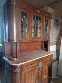 Vendesi splendida credenza d'epoca dei primi del Novecento, un capolavoro di artigianato che unisce eleganza vintage e massima funzionalità. Ideale per chi cerca un pezzo unico capace di dare carattere a un salone classico o di creare un contrasto ricercato in un ambiente moderno. Dettagli di pregio: • Corpo Superiore: 3 ante con iconici vetri verde scuro incorniciati da geometrie d'epoca che creano riflessi unici. • Decorazioni Neoclassiche: Splendidi fregi in metallo dorato che raffigurano putti e ghirlande floreali, simbolo di raffinatezza e cura del dettaglio. • Materiali: Struttura solida in legno massiccio con maniglie originali in ottone a motivo floreale. • Organizzazione: 2 ampi cassetti e 2 grandi ante inferiori per un'altissima capacità di contenimento. 📏 Dimensioni • Altezza: 216 cm • Larghezza: 146 cm • Profondità: 51 cm 💰 Prezzo e Condizioni • Prezzo: € 550,00 (leggermente trattabile) • Stato: Ottime condizioni vintage, solida e pronta all'uso. Appena restaurata • Ritiro: A carico dell'acquirente a Villafranca di Forli