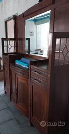 Vendo credenza antica in stile Liberty con specchiera, 4 cassetti laterali e 1 cassetto grande in centro, 2 ante laterali e una doppia anta al centro, ognuna con ripiano centrale. cm 161x41x200 h € 400 per info: 3388058501 NON SPEDISCO
