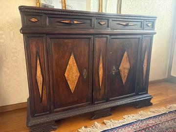 credenza antica in legno di latifoglia intagliato con inserti in radica. Il mobile molto massiccio è probabilmente un rifacimento in stile o una ricostruzione con elementi antichi e moderni. si presenta in buona stato di conservazione