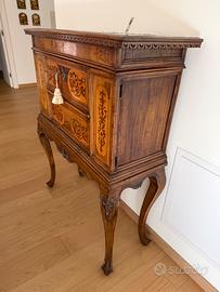 Elegante credenza italiana del XX secolo. Mobile di gusto veneto intarsiato in legni di noce, acero e legni da frutto, di piacevole arredamento. Credenza a due ante laterali con ripiani interni e antina centrale a calatoia, di ottimo servizio. Mobile munito di due cassetti nella parte superiore, di buona capacità. Credenza strutturalmente sana, sorretta da quattro solide gambe. Presenta alcuni segni del tempo, nel complesso in buone condizioni.