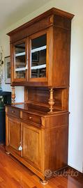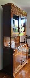 Credenza in noce massello lucidato, costituita da elemento base a due ante con ripiano centrale e n. 2 cassetti il tutto rivestito internamente con carta giglio fiorentino, parte superiore a due ante con vetri e n. 2 ripiani interni, sorretta da colonne tornite. E’ un ottimo pezzo di antiquariato dei primi anni del Novecento, in perfetto stato di conservazione ed assolutamente priva di tarli, molto bella e particolare, difficile da trovare sul mercato