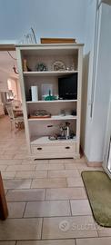 Credenza in legno colore Bianco latte. Credenza aperta senza sportelli con ripiani e un ampio cassetto in basso.