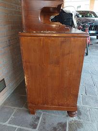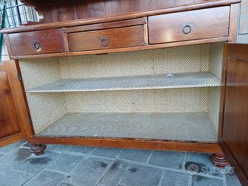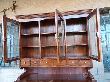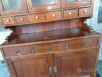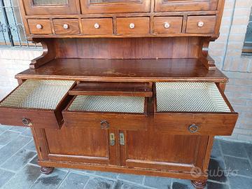 credenza in legno con alzata composta da 2 parti . inferiormente3 ampi cassetti, 2 ante che contengono 3 piani d'appoggio. la parte superiore comprende 3 vetrinetta ognuna con 2 ripiani. 6 piccoli cassetti. dimensioni H 204 L 132 P 53