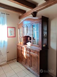 Credenza in legno in arte povera con vetrinette, vani chiusi e cassetti. Dimensioni: lunghezza 168 cm, altezza 220 cm, profondità 50 cm, profondità vetrinette 35 cm.
