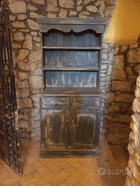 Vendesi una bella Credenza azzurra decapata composta da due elementi. L'elemento a terra si compone di due sportelli a credenza con due ripiani all'interno e due cassetti con pomello in legno, l'elemento superiore composto da ripiano per riporre tazze e tazzine. Un singolare elemento di arredo per cucina, camera da pranzo, salotto. misure: il mobile basso con gli sportellie e due cassetti misura, larghezza 84 cm. altezza 90 cm. profondità 46 cm. la parte alta, che può essere appesa al muro o appoggiata, come nella foto, sul mobile basso, misura larghezza cm 78. altezza 90 cm profondità 22 cm. Importante ogni contatto solo tramite whatsapp al 3394964944