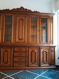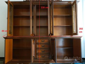 Elegante credenza (media) in legno massello con intagli ornamentali fatti a mano, ideale per arredamento classico, barocco o vintage. Parte superiore con ante in vetro e cornice in legno, perfetta per esporre cristalleria, stoviglie o decorazioni. Parte inferiore con 4 cassetti centrali e ante laterali per un ampio spazio di stoccaggio: ottima per posate, tovaglie e utensili.
