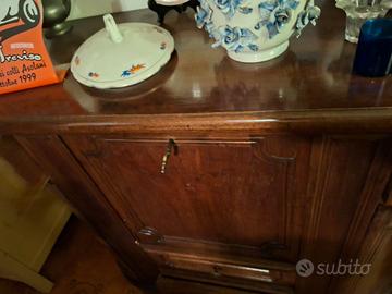 Vendo Mobile Credenza Bassa Sagomata in Noce con Ribalta con Chiave, N.2 Ante Laterali con Chiave, N.4 Cassetti. Ideale come contenitore Porta Piatti e Liquori. Larghezza: 143cm, Altezza: 92cm, Profondità: 43cm. 50 euro non trattabili, pagabili in contanti al ritiro zona Treviso Selvana. Non spedisco.