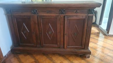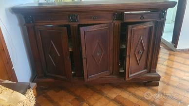 Credenza bassa primi anni del novecento con tre ante e tre cassetti . perfette condizioni , dovute anche da recente restaurazione . L' interno è composto da due ripiani lunghi quanto la credenza donando così ampia possibilità contenitiva. Presenta in alto una piccola imperfezione dovuta dal logorio del tempo.