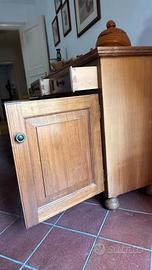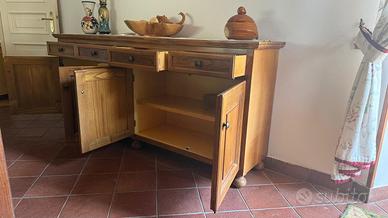 Credenza bassa rustica artigianale (incastri a coda di rondine) con 4 cassetti, 4 sportelli e 6 piedi a cipolla in legno massello – condizioni impeccabili – misure cm. 208 x 43 x 90