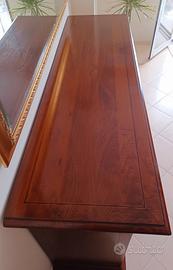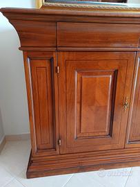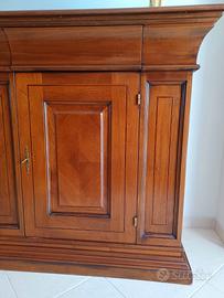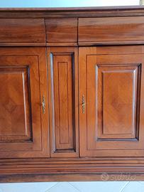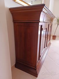 misure 180L x 110H x 53P. Credenza leggermente anticata, frontale con intarsi in bassorilievo, 2 ante (55×75) con filetto, riquadrate e incorniciate, 2 cassetti a scomparsa (55x20x53), 2 cassetti nascosti (20x20x53), 2 ripiani.