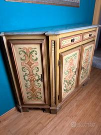 credenza (o buffet / sideboard) in stile barocco veneziano revival o eclettico italiano. Dimensioni: larghezza base maggiore 155cm, base minore 90cm, h100cm e profindità 45cm