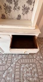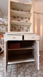 Credenza in legno stile shabby chic, completamente restaurata a mano, ideale per aggiungere carattere e calore a qualsiasi ambiente. Il mobile si distingue per la sua elegante finitura bianco decapato, che mette in risalto le venature naturali del legno e dona un raffinato effetto vissuto. La parte superiore è impreziosita da una delicata decorazione intagliata e da uno sfondo rivestito con carta decorativa floreale, perfetto per esporre oggetti, libri o stoviglie. Composta da: Due ampi ripiani a vista nella parte superiore Due cassetti scorrevoli, spaziosi e funzionali Due ante inferiori con ripiano interno, ideali per contenere oggetti più voluminosi La struttura è solida e robusta, con interni in legno naturale che creano un piacevole contrasto con l’esterno. Perfetta per cucina, soggiorno o casa di campagna, ma anche per ambienti moderni in cerca di un tocco vintage. Un pezzo unico, pronto all’uso, che unisce praticità ed estetica. Ritiro in sede