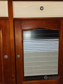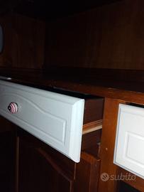 credenza (due pezzi)molto capiente,in due ante carta adesiva facile da rimuovere per chi non piacesse...cassetti dipinti di bianco,pomelli simpatici.