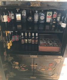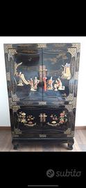 Credenza cinese in legno laccato e dipinto a mano con decorazioni in rilievo in pietra ollare.