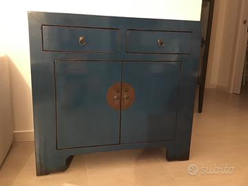 Credenza cinese in legno blu. Misure 91 cm di lunghezza, 43 cm di larghezza/profondità, 84 altezza. Finitura lucida. Maniglie in rame. Due scaffali interni.