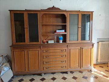 Grande credenza in legno stile classico, composta da vetrina superiore con ante in vetro e vano centrale a giorno e base con ante e cassettiera centrale. Ideale per soggiorno e sala da pranzo. In buone condizioni.cm 260x48x200