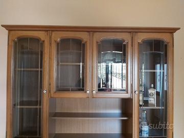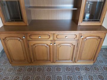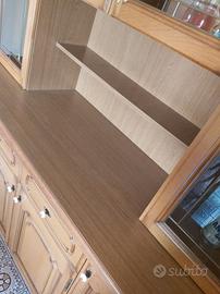 Credenza classica in legno con vetrina superiore. Il mobile è strutturato a doppio corpo, con una base dotata di ante e cassetti e una parte superiore con vetrinette. È realizzata in materiali simili al legno massello, spesso noce o pino, tipico di stili rustici o classici. Dimensioni: larghezza 183 cm, profondità 60 cm e altezza 215 cm.