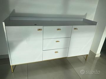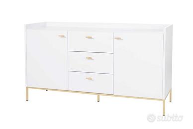 Dimensioni del cassetto: 40 cm di lunghezza, 17 cm di altezza, 33,5 cm di larghezza). Altezza della base in metallo: 15 cm · Materiale: melamina da 19 mm, metallo · Colore: bianco come la neve, oro