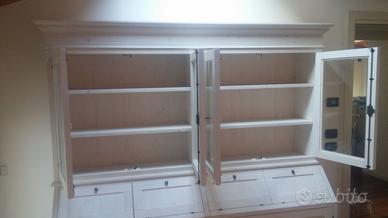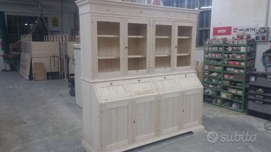 Base credenza con alzata con misura lunghezza 200 altezza 220 profondità inferiore 50 profondità superiore 40. Composta con zoccolo leggermente sagomato aperto, 4 ante costruite con telaio e pannello interno inserito e si aprirà su cerniere in stile regolabili con scrocchetto per tenere chiusa chiave con serratura. sopra troveremo 4 antine che si apriranno sempre con medesime cerniere 4 scrocchetti e catenella per aiutare anta in caso di sforzo eccessivo in modo da non creare problemi futuri, pannello applicato posteriormente sempre in abete con listelli ferma pannello. Coperta con cornice a becco di civetta, sopra avremmo alzata che si applicherà con apposite spine in legno con perni e bussole per agevolare il montaggio trasporto con 4 ante che si apriranno su cerniere in stile con telaio e vetro applicato complete di serratura ad asta per avere una chiusura omogenea e perchè non si incurvi nel tempo, sopra il cappello con cornice sagomata con varie cornici. Il tutto costruito in abete massello di prima qualità. Troveremo 1 ripiano interno aggiustabile nella parte sotto e 2 ripiani aggiustabili per ogni vano tramite una serie fori e bussole per poter spostarli a piacimento. Gli schienali posteriore da 14 mm verrà avvitato posteriormente tramite viti. Tutto verrà spazzolato da poter eseguire una laccatura sbiancata sia internamente che esternamente. Dato che noi siamo i diretti costruttori li facciamo noi con le nostre mani siamo in grado di soddisfare qualsiasi richiesta che può essere su misura del cliente. il prezzo si intende franco fabbrica compreso di finitura sbiancata vetri imballo non comprendente di iva. prodotto e venduto su commissione, non teniamo magazzino ma dato che siamo i diretti produttori costruiamo in base alle proprie esigenze. per domande o dubbi contattateci, astenersi rivenditori e commercianti