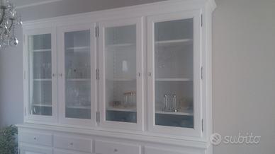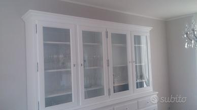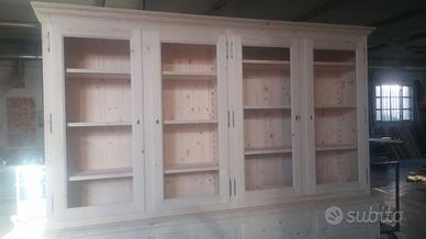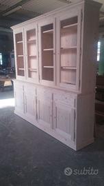 Credenza con alzata in abete massello spazzolato con misure misura lungh. 260 prof. 50 base alzata 35 circa h 240 totale h credenza circa 105 alzata 130/135 circa. predisposta la base con 4 ante costruite con telaio e pannello inserito posteriormente, si apriranno su cerniere in stile non ammortizzate con chiave e serratura, internamente troveremo 1 ripiano aggiustabile in abete. Sopra alle ante troveremo 4 cassetti che scorreranno su guide ammortizzate in chiusura e si apriranno con pomello con pietra swaroski, interno cassetto in abete con sponde da 18 e fondo da 14. Alzata predisposta con 4 ante che avranno inserite vetro trasparente e si apriranno sempre con cerniere in stile e con 3 ripiani interni spessore 2.4 cm con legno inserito alle estremità per dare robustezza al tutto e non si incurvino aggiustabili con scalette cremagliera, costruite con telaio e la chiusura ad asta con chiave in modo che restino dritte nel tempo. completo di zoccolo chiuso sottostante con varie modanature e di gambette livellatrici nascoste dietro lo zoccolo e smontabile per il trasporto tramite ferramenta adatta con spine in legno barilotti con perni. tutto laccato coprente poro aperto spazzolato rall 9010. nel prezzo è compreso vetri pomelli swaroski e laccatura ral 9010 franco fabbrica completo di imballo iva non comprensiva. Competenza serietà ed esperienza nel settore del mobile ci contraddistinguono dal resto dei venditori. ordinata su commissione e non è in pronta consegna ma essendo i diretti produttori possiamo costruirla uguale o modificando misure e finiture. In quanto siamo i diretti PRODUTTORI FALEGNAMI. su questo modello sono stati realizzati negozio parafarmacia, negozio bio e alimentare pane e salumi. Per qualsiasi altra informazione non esitate a contattarci. ASTENERSI RIVENDITORI E COMMERCIANTI