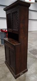 Le ante superiori presentano un motivo a grata decorativa e vi sono maniglie in metallo, tipiche di questo genere di arredamento. Questo mobile unisce funzionalità e uno stile caldo e senza tempo, ideale per ambienti classici o rustici.