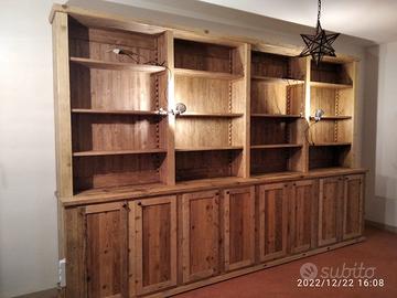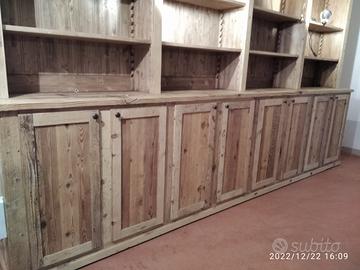 credenza/bancone con alzata superiore: con misura lunghezza 370 prof. 50/35 h 92+145 sarà smontato e suddiviso in 4 vani uguali in cui la parte sotto con zoccolo h 6 cm con piedini livellatori per mettere a bolla il tutto, fianchi esterni laterali in abete vecchio massello con spalletta applicata e cremagliera interna. I 4 vani saranno applicate 8 ante di cui 4 dx e 4 sx con telaio e pannello inserito posteriormente e pomello per apertura con cerniere da cucina regolabili nascoste ammortizzate in chiusura 1 ripiano interno aggiustabile su cremagliera per vano in abete massello (4ripiani). Top massello di abete vecchio interno. Sopra troveremo 4 vani uguali a giorno dove troveremo spallette in legno vecchio frontale e laterale fianco in pattina, totale 12 ripiani (3 x vano) aggiustabili con cremagliera in abete nuovo. Cappello di chiusura con fascia cornicetta in legno vecchio. Varia ferramenta di fissaggio per unione del tutto, finitura cera trasparente su legno vecchio e noce medio su abete nuovo. schienale posteriore da 14 mm con fascia alle estremità con incisione a V fuga (come fossero finte doghe) costruito su commissione ed esigenze del cliente, non è disponibile a magazzino ma essendo i diretti produttori falegnami possiamo riprodurlo uguale o in base alle proprie esigenze. per domande o dubbi contattateci P.S. disponibili a dare suggerimenti o chiarimenti in merito, per noi conta dare vita al vostro sogno DIRETTAMENTE DAL PRODUTTORE ASTENERSI RIVENDITORI O COMMERCIANTI