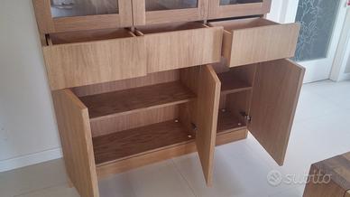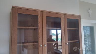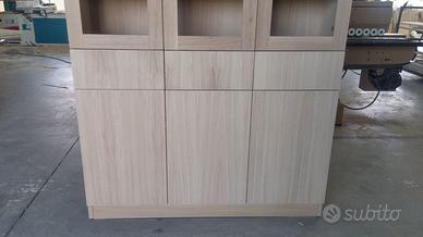 Credenza con alzata costruita in listellare ricoperto di rovere con misura lungh.135 prof.35 h 210 composto da 3 ante nella parte bassa con ripiano interno aggiustabile in altezza mentre la parte centrale con 3 cassetti che scorreranno su guide ammortizzate e con apertura a push pressione. nella parte superiore abbiamo 3 ante con telaio in massello di rovere e vetro inserito con cerniere ammortizzate regolabili da cucina. Nella parte superiore avremmo 3 ripiani aggiustabili per ogni vano. L'interno cassetto sarà costruito in faggio massello, mentre le ante lisce lineari. Schienale in multistrato di rovere. Il tutto è spazzolato con finitura compresa nel prezzo sarà fatto con effetto grezzo naturale trasparente naturale franco fabbrica con imballo iva non comprendente. mobile prodotto su commissione e venduto non teniamo magazzino ma essendo noi noi i diretti produttori abbiamo la possibilità di costruirlo uguale o su specifiche del cliente e una volta confermato di fare un rendering con cad per vedere come sarà una volta terminato il mobile per dare proporzioni e particolari realistici. Per qualsiasi altra informazione non esitate a contattarci. ASTENERSI RIVENDITORI E COMMERCIANTI