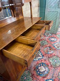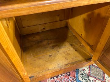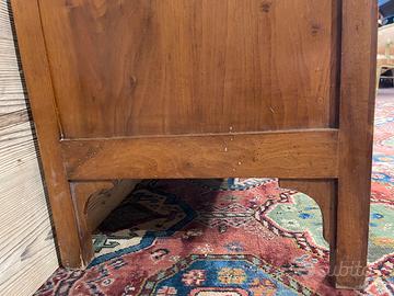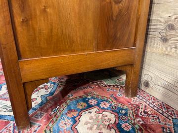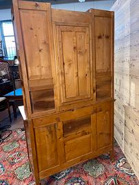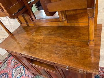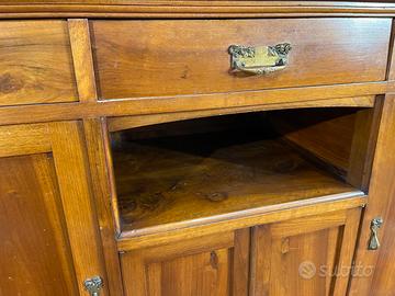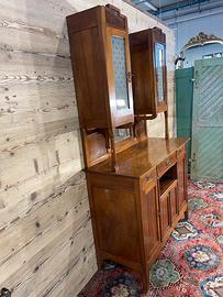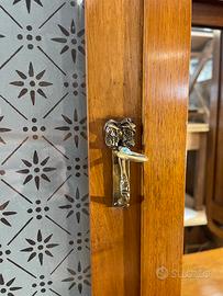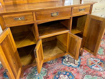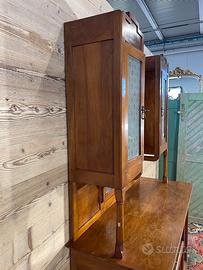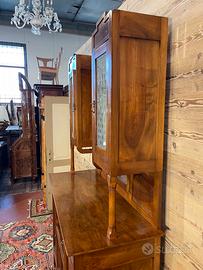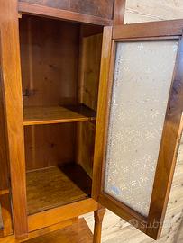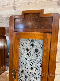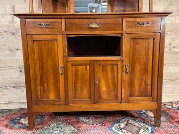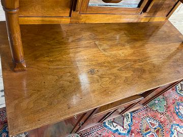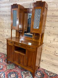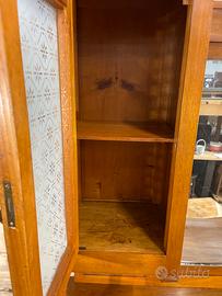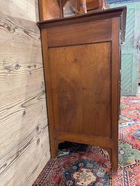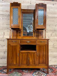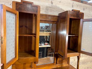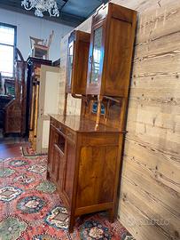 Credenza con vetrina in noce, della prima metà del ‘900, in buone condizioni ma non restaurata. Dimensioni massime di ingombro 127 x 53 cm ed altezza totale 214 cm. Altezza top credenza 110 cm.