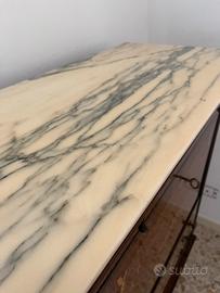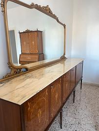 Credenza con specchio. Credenza in legno con specchio intarsiato stile classico Elegante credenza/buffet in legno con decorazioni intarsiate e grande specchio coordinato. Ampio spazio contenitivo, perfetta per sala da pranzo o soggiorno. Condizioni: buone, con segni del tempo. Ritiro a carico dell’acquirente.