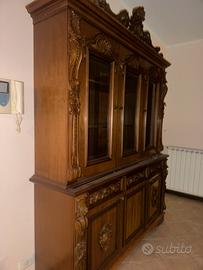 Vendo elegante credenza con vetrina in legno massiccio, lavorata con dettagli intagliati e finiture di pregio. Il mobile è composto da una parte superiore con tre ante in vetro, ideale per esporre servizi o oggetti decorativi, e da una parte inferiore con ampi vani chiusi e cassetti molto capienti.