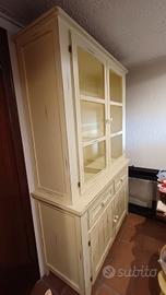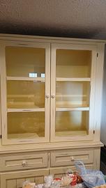 Vendo pezzo unico e originale. Credenza con vetrina stile shabby chic colore avorio con pennellate sull azzurro, maniglie in ceramica, 2 cassetti e 2 ante, vetrina con 2 scaffali, vetrina staccabile. Nato come espositore di ceramiche Wald.