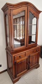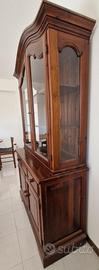 Vetrina in legno massello. Misure: Cm 112x47x h206. Design caratteristico con “cappello a gendarme” per la forma curva superiore. Il mobile è composto da due corpi sovrapposti: Una base con cassettone e ante chiuse e un alzata con ante e laterali in vetro. Include pomoli e maniglie in legno e base a zoccolo pieno.