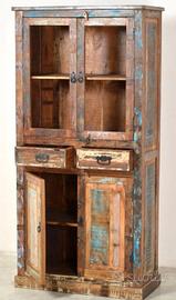 Credenza con vetrina in legno massello di recupero (Legno massello di recupero: Il legno massello di recupero è costituito da legni riutilizzati quali il teak, il legno di mango, il legno di pino e il faggio. Questi materiali sono riciclati da vecchi immobili come fabbriche, capannoni e barche. Poiché che ogni pezzo è lavorato a mano, i colori variano per ogni articolo.)