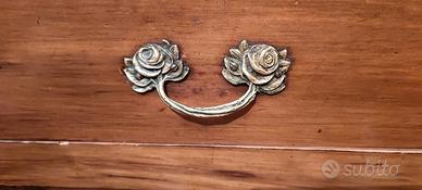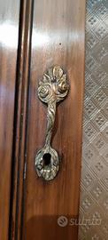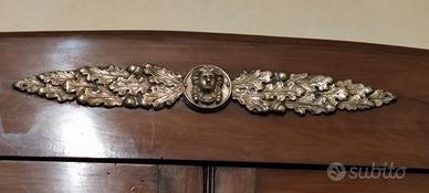 Credenza Liberty, splendide maniglie e decorazioni in bronzo originali. Composta di due parti, che possono essere utilizzate sovrapposte o separatamente: una parte ha due sportelli con ripiani interni e due cassetti, l'altra ha una vetrinetta con due sportelli e due ripiani interni. Dimensioni totali h cm 224 largh cm 115 prof cm 45. La base: h cm 104, largh 115 prof. 45. La vetrina superiore: h cm 120 largh 101 prof cm 32. lievi imperfezioni dovute all'età.