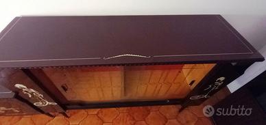 Tipo:Vetrina con 2 ante scorrevoli. Stile:classico in legno massello e decorazioni laccate. Piano in vetro decorato. Stato: Vissuto- ben conservata. Misure:160x45h125